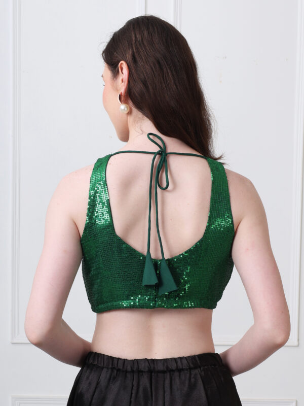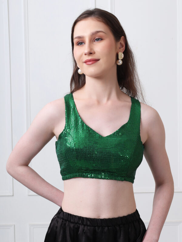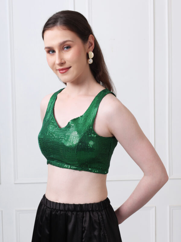 Green Sequins Padded Blouse has a Sweetheart Neck, Sleeveless and Hook & Eye Closure with adjustable Dori tie at back. This Blouse can be easily styled with skirts, lehengas, palazzos, shararas and sarees.